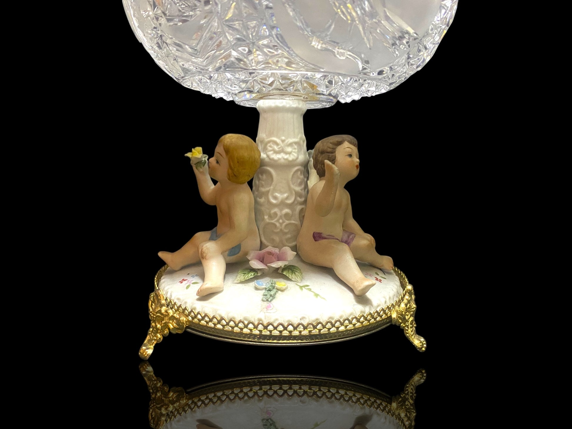 Antique Italian Bonbonniere with Lid — Hand-Engraved Czech Crystal and Capodimonte Porcelain Figures